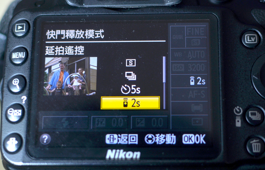 但有些較低階的NIKON相機的拍攝選單並沒有遙控模式,也沒有指令撥盤,要直接按下快門釋放模式按鈕設定到遙控器圖示的功能。