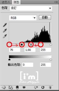 色階的調整方式基本上都大同小異,將左右的箭頭拉至色階區後,主要是要把中間的箭頭往左拉(調亮)一些,每張圖不一定,請依自己的原圖來做設定。
