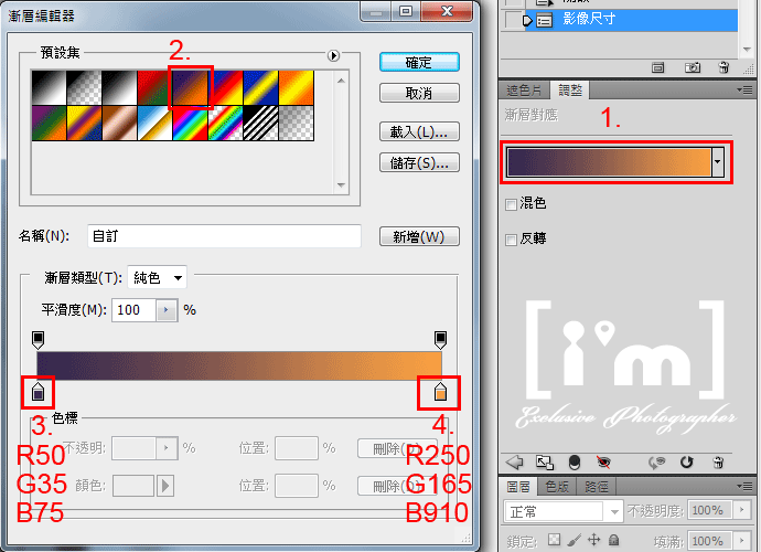 開啟漸層對應圖層後如上圖進入調整漸層與漸層的顏色改變,