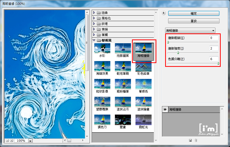 濾鏡>濾鏡收藏館>海報邊緣,數值如上圖設定。
