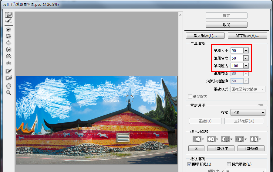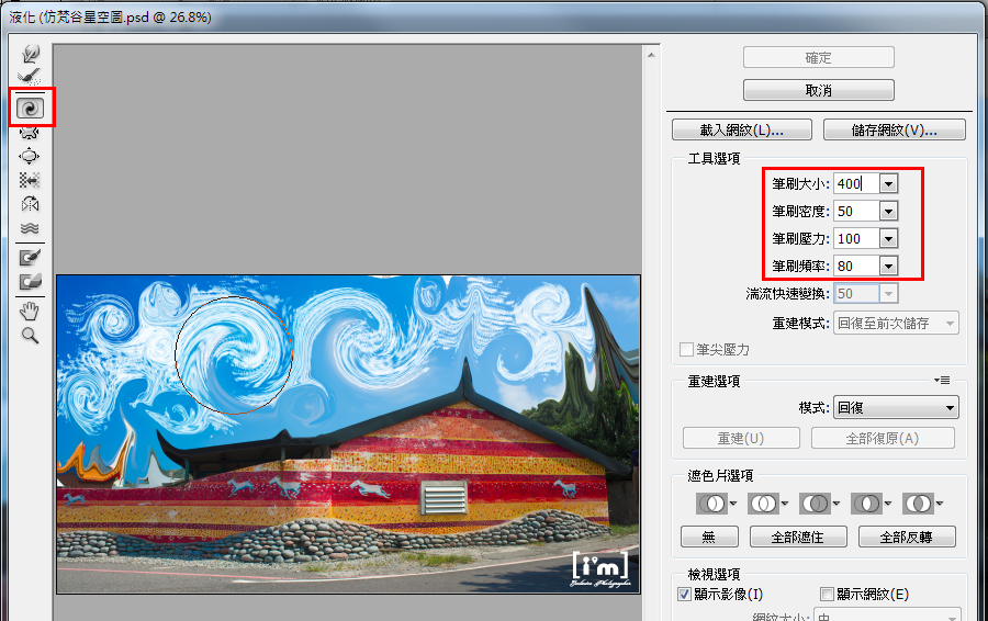再用順時針扭轉工具(筆刷尺寸大約如上圖)將天空的雲層轉成圈圈。