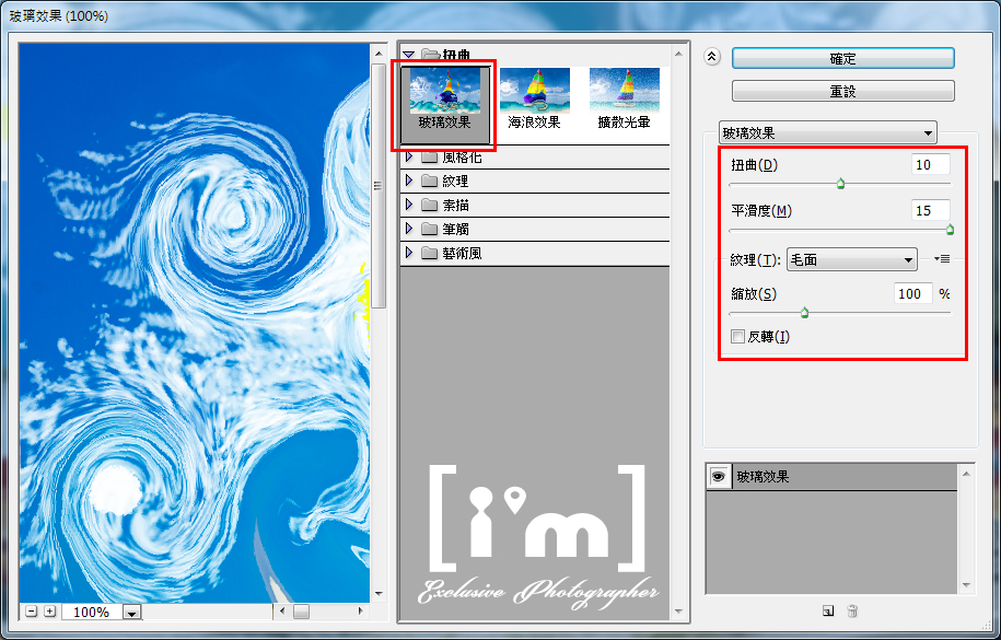 濾鏡>濾鏡收藏館>玻璃效果,數值如上圖再注意自己依感覺修正哦。