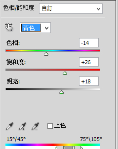黃色色相-14也是為了偏橘,飽和度+26,明亮+18。