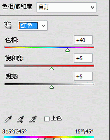 先進入紅色,日系色調中幾乎沒有大紅色,所以我把色相+40讓紅色也變橘色,飽和度跟明亮各+5。