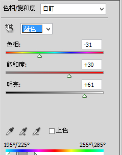 藍色色相-31也是要讓他偏青色,飽和度+30,明亮+61。